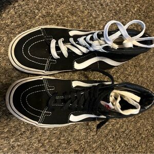 Classic Vans sneakers for women or men. Black canvas with white accents. Perfect for casual wear.