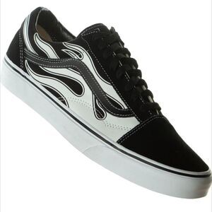 These Vans sneakers feature a sleek black upper with a striking white swoosh-like design on the side. The white midsole provides a bold contrast, while the flat sole enhances the classic skate-style silhouette.