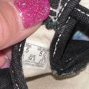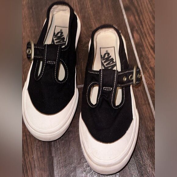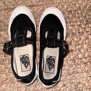 Stylish Vans sneakers. Black upper with white sole. Slip-on design with unique strap.