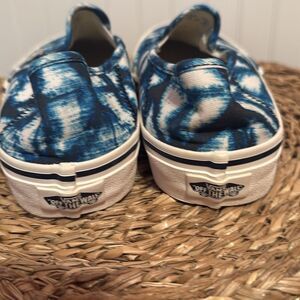 Stylish Vans slip-on sneakers with a blue tie-dye pattern. Comfortable and trendy.