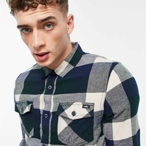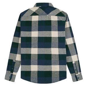 Stylish plaid button-up shirt with a classic design. Features a mix of blue, green, and white colors.