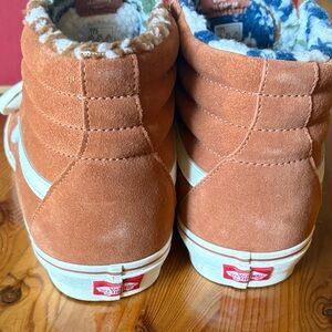 Stylish Vans high-top shoes. Brown suede with white accents. Cozy interior lining.
