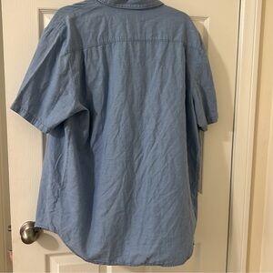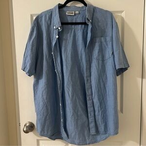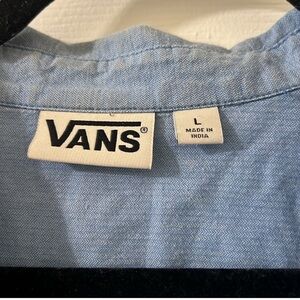 Light blue short-sleeve shirt. Button-down style. Single chest pocket. Classic Vans design.