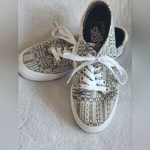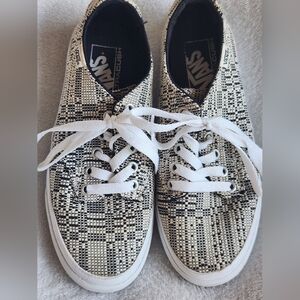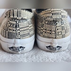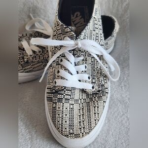 Vans Camden Deluxe sneakers in a black and cream optical woven pattern.