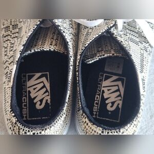 White laces, white rubber soles, and the Vans "UltraCush" insole for added comfort. The Vans logo is visible on the side and insole of the shoes. Fabric upper and lining.