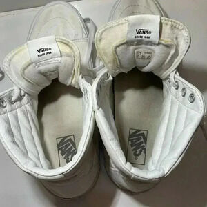 These Vans are used, on both shoes one side of the shoelace tip plastic came off, there are dark scuff marks on one shoe a little bit more than the other and shoe lace area on one shoe has a slight discoloration. I have washed these. Plus dark marks on the rubber. Other than that these sneakers are in good condition.