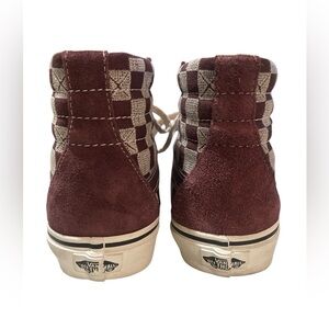 Stylish Vans high-top sneakers with a checkerboard pattern. Features a maroon and cream color scheme.