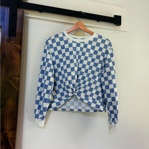 Super cute Vans top with a blue and white checkerboard print and a stylish twist-knot detail in the front. Lightweight and comfy, perfect for casual wear or layering.