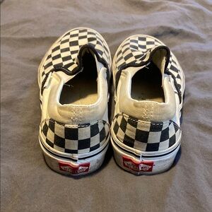Classic Vans slip-on sneakers with a black and white checkerboard pattern. Comfortable and stylish.