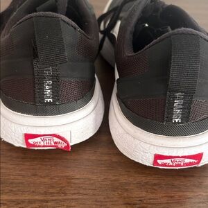 Ultra-Range Vans shoes with a black upper and white accents. Lace-up design for a secure fit. Some wearing but still has a lot of life