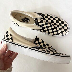 Classic slip-on Vans with a too-cool checkered design. Featuring sturdy canvas upper and rubber sole for an ultra-comfortable wear.
