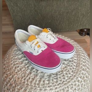 Worn but still lots of life left! Hot pink, teal white and yellow colorblock. Womens 7.5. White part is a corduroy-type material.