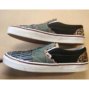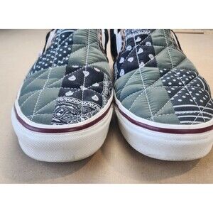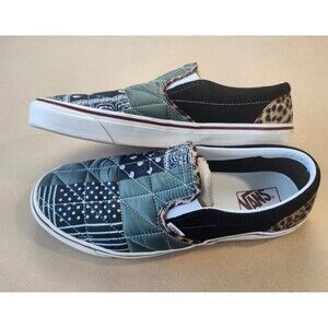 These Vans Classic Slip-On 98 DX Anaheim Factory - Quilted Mix size 13 Shoes feature a stunning patchwork quilted design with bandana-style paisley, polka dots, and animalprints in earthy tones of blue, black, and white and burgundy trim