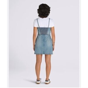 Chic denim dress with button-down front. Features adjustable straps and pockets. NWOT Size medium
