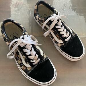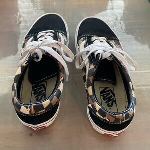 Size 4.5 men or 5 women black, white, tan and brown sneakers by Vans in excellent preowned condition.
