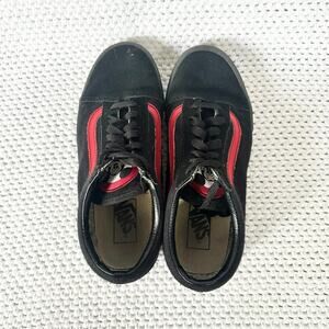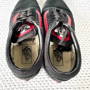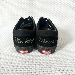 Size 6 men's or 7.5 women's. From Vans Disney collaboration. Old Skool Mickey Mouse Club. Black suede low top lace up sneakers with red stripe. Mickey Mouse emblem on tongue with embroidered Mickey signature on back heel. Preowned in good condition with light signs of wear throughout.