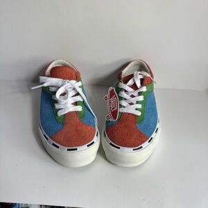 Vibrant Vans sneakers. Features blue, green, and orange suede. Perfect for active play.