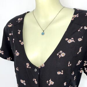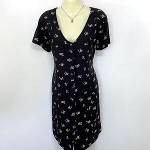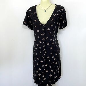 BY VANS, HERE IS AN ADORABLE DRESS. IT IS DONE IN VISCOSE, LIGHT AND AIRY. THIS DARLING DRESS IS BLACK WITH TINY WHITE DAISIES OVER IT. IT FEATURES A V NECK AND CAPPED SLEEVES WITH A SEVEN BUTTON DOWN FRONT. EXCELLENT CONDITION, SIZE MEDIUM, PLEASE NOTE THE MEASUREMENTS