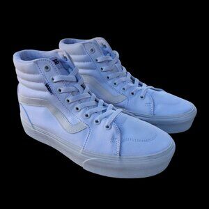 NWOT: Stylish, white "Filmore" canvas upper hi-top sneakers with double stitched upper / high top silhouette / side stripe branding / foam footbed / vulcanized sole / round toe / lace-up closure / logo emblems by Vans. In excellent like new condition with intact seams & insoles. Size: 10