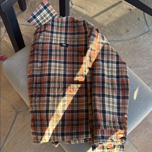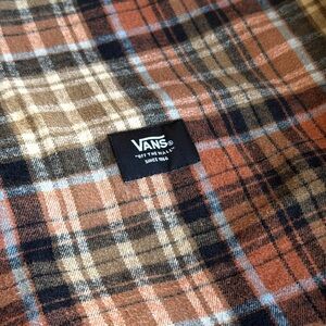Stylish Vans flannel jacket . Features orange, cream, and black tones. Ideal for everyday wear and layering.