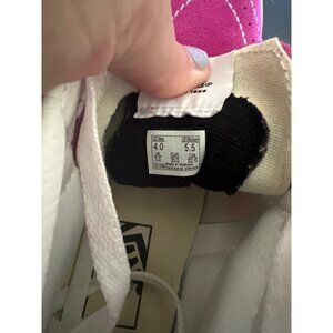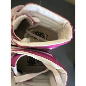 Bold fuchsia high-tops with white detailing. Classic Vans style.
