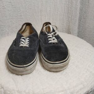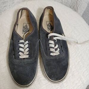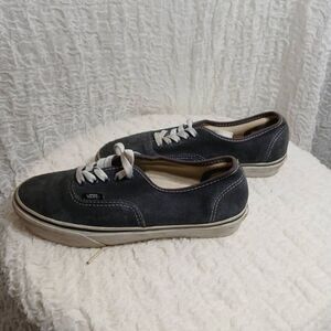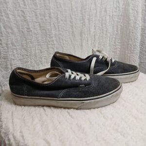 Dark gray classic style Vans sneakers with white shoelaces. Pre-owned in fair used condition. Please refer to pictures for best description and condition verification.