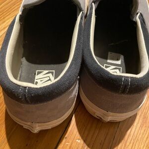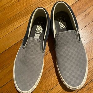 Stylish Vans slip-on sneakers. Gray checkered pattern. Black accents. Comfortable and casual.