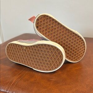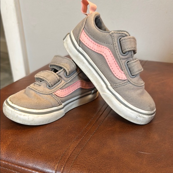 Vans sneakers with gray body and pink stripe. Easy velcro closure. Ideal for active kids.
