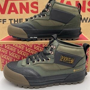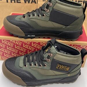 Stylish Vans lace-up boots. Durable design with green and black tones. Perfect for outdoor adventures.