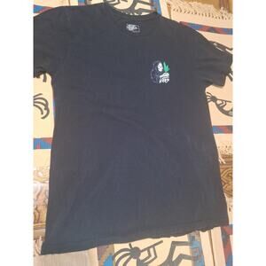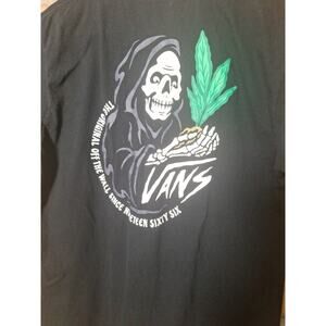 Vans short sleeve graphic tee featuring the Grim Reaper holding a green leaf. Black 100% cotton shirt with front mini graphic and large back hit. Soft and broken-in with normal light wear.