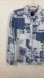 Long sleeve woven top in Ashley Blue geometric print. Colors are light beige and blue in patchwork design. Shirt is button front with spread collar and two front patch pockets on the chest.