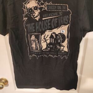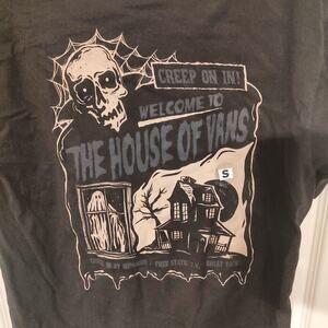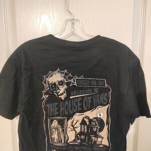 This is a stylish Vans T-shirt featuring a unique design that showcases the "House of Vans" theme. The shirt is predominantly black, making it versatile for various outfits. The front of the shirt displays a graphic with a skull, spiderwebs, and a haunted house, accompanied by the text "Creep on in! Welcome to THE HOUSE OF VANS". This eye-catching design is perfect for fans of the brand and those who enjoy a bit of spooky flair. The shirt is in excellent condition, with no visible signs of wear. It is a classic fit and made from comfortable material, ideal for casual wear or layering. The tag indicates the size as Small (S), and the model number is VN000RSMBLK. This shirt is a must-have for any Vans enthusiast or collector!