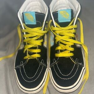 Vibrant yellow laces. Classic black high-top design. Comfortable and stylish.