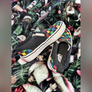 Vans Kids Slip-On Shoes feature a vibrant multicolor checkerboard design. Perfect for adding a pop of color to any outfit. Comfortable and easy to wear.
