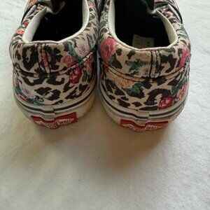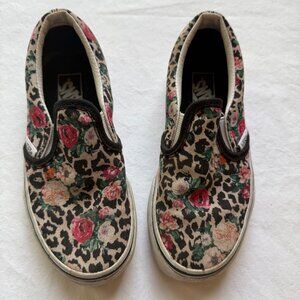 Durable slip-on sneakers with a bold leopard and floral print. Comfortable canvas upper and sturdy rubber soles for everyday wear. Vans kids size 13. Gently used. Standard wear. Smoke free home.