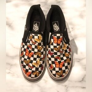 These Vans slip-on shoes feature a vibrant butterfly and checkered design, perfect for adding a playful touch to any outfit. The black and multicolor pattern makes them a standout choice for kids.