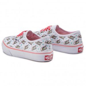 Fun Vans sneakers for kids. White base with playful patterns. Pink laces add a pop of color.