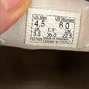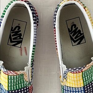 These LGBTQ Pride Vans sneakers feature a vibrant multicolored patchwork pattern with shades of the rainbow. The slip-on design offers a comfortable fit, making them perfect for casual wear. The low-top silhouette and lively colors create a stylish and fun look. These auth and fun Vans sneakers have been pre loved, are in good condition, and come from a smoke free home.