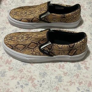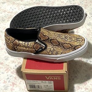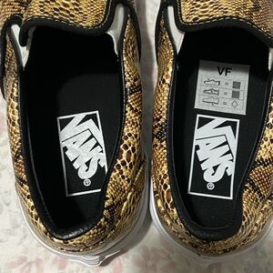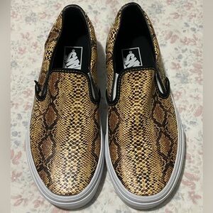 New, Vans slip-ons with a striking snake pattern. Gold and black design. Comfortable and stylish.