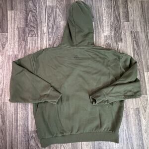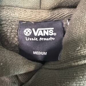 This is a Vans Lizzie Armanto collab hoodie in olive green. Made of a 60% cotton / 40% polyester blend like the original. Features a wood-grain textured front pocket design, Vans and Lizzie Armanto branding. Oversized fit. Great piece for skatewear or streetwear styling.
