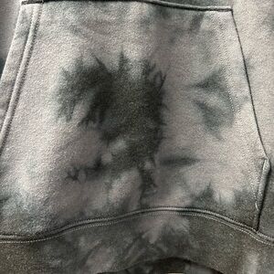 It is a black and grey tie-dye design, with the Vans logo on the upper left chest and a kangaroo pocket in the front.