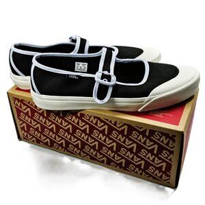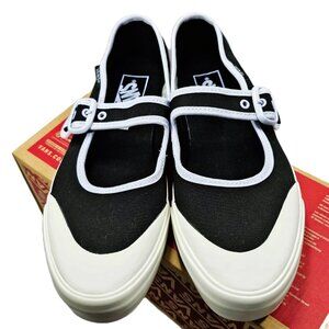 🖤 Add a playful twist to your sneaker collection with these brand new Vans Mary Jane sneakers in the rare “Ballerina Black” colorway. Crafted in black canvas with light blue trim and a matching adjustable buckle strap, these shoes blend retro charm with modern comfort. Finished with a crisp white rubber sole and signature Vans styling, they’re perfect for casual looks with a feminine edge.