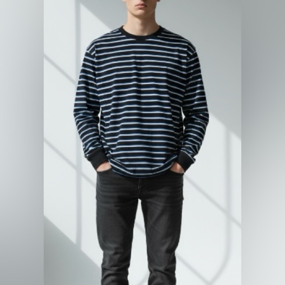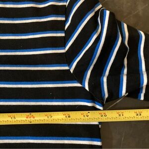 Vans Men's Small Blue & White Striped Long Sleeve Shirt. This classic Vans long sleeve tee features a stylish striped pattern in black, blue, and white, perfect for casual wear or skateboarding. Made for comfort, it's a versatile addition to any wardrobe.
