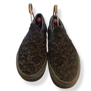 These Vans slip-on sneakers showcase a bold skull print design in black and gray. Crafted for comfort and style, they are suitable for casual wear.