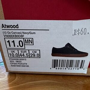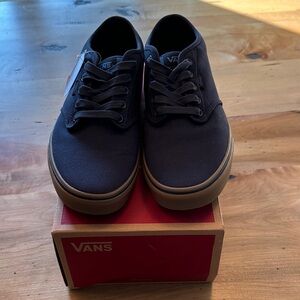 Stylish Vans Atwood sneakers with a navy canvas upper. Features durable brown gum soles. Perfect for casual outings.