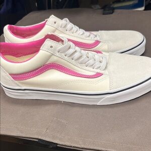 Classic Vans sneakers with a cream body and pink highlights. Perfect for casual outings.