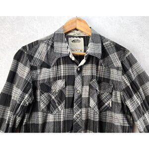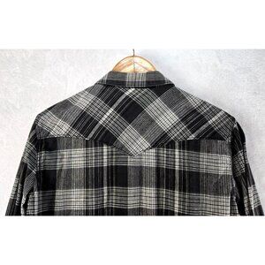 Men's plaid, long sleeve shirt in all cotton. Shades of gray, black and white. Snap front and on cuffs and pocket flaps. Previously owned in good condition, but it looks like it may run small to size, so please check the measurements.