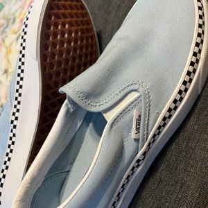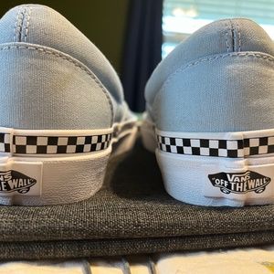 Sky blue Vans slip-ons with classic checkered trim. Easy to wear and versatile. Ideal for everyday style.