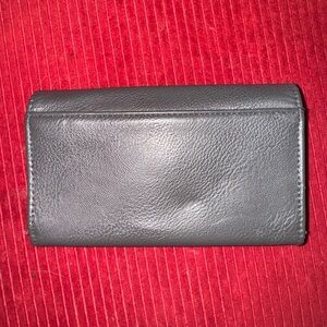 Metallic gray vans off the wall with floral inside. Multitask for cards, cash, and coins.