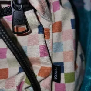Compact Vans backpack with a colorful checkered print. Drawstring closure and front zip pocket. Black straps and trim. Playful everyday style.